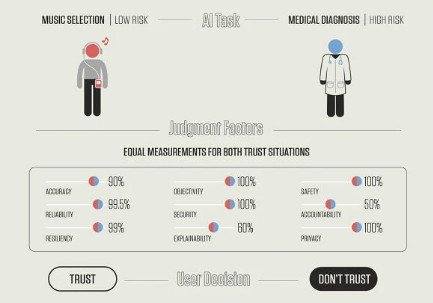 例如,一个因素是准确性。音乐选择算法可能不需要过于准确,特别是如果一个人有时好奇地超越自己的口味以体验新奇——无论如何,跳到下一首歌很容易。信任一个在癌症诊断中只有 90% 准确率的人工智能将是另一回事,这是一项风险更大的任务。