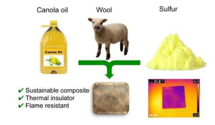 Chalker副教授说:“这项新研究的目的是评估由硫,低芥酸菜子油和羊毛制成的复合材料,作为隔热材料。该材料是通过将生羊毛与由硫和低芥酸菜子油制成的聚合物热压制成的。”
