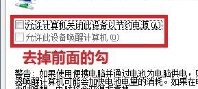 5、进入如下的界面后,我们在选项卡中选择“电源管理”,然后我们取消“允许计算机关闭此设备以节约用户电源”以及“运行此设备唤醒计算机”的两个勾选,点击确定保存后即可。
